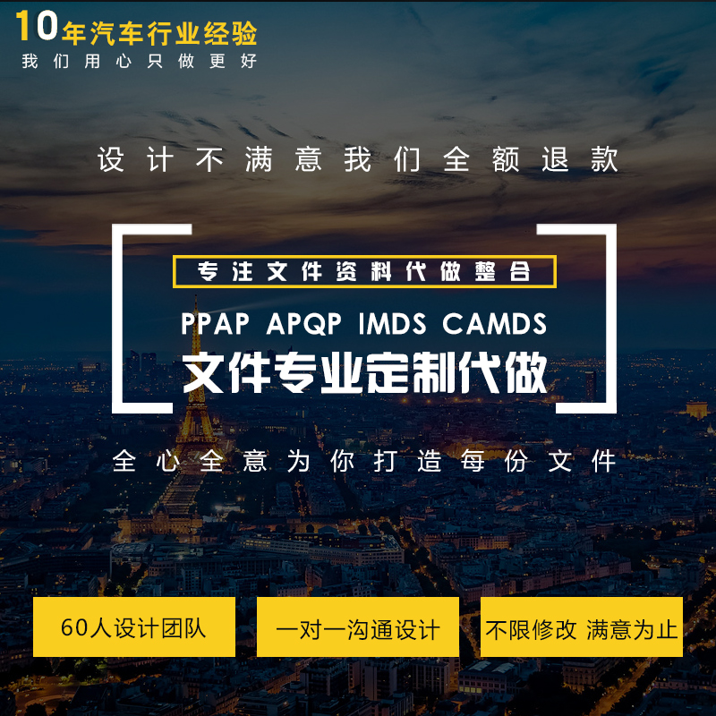專精于五金件、注塑件、緊固件,特殊加工零件,汽車零部件等產(chǎn)品的PPAP、IMDS、CAMDS、FMEA、8D報告等技術文件輔導制作服務。